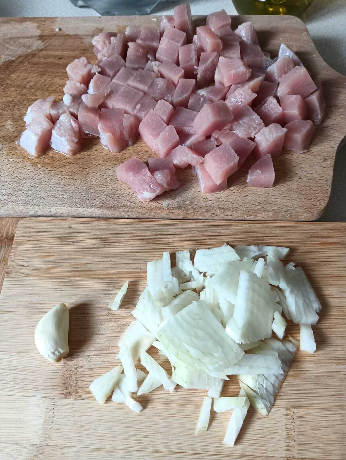Na dno rozgrzanego suchego garnka o grubym dnie wycisnąć ząbek czosnku. Jak zacznie pięknie pachnąć, dodać pokrojone w kostkę mięso i cebulę. Chwilę dusić. Dodać pokrojone w plasterki pieczarki. Dusić. Dodać pozostałe warzywa i przyprawy, uzupełnić wrzącą wodą (zgodnie z własnymi preferencjami dot. gęstości dania). Dusić do miękkości. Przyprawić maggi.