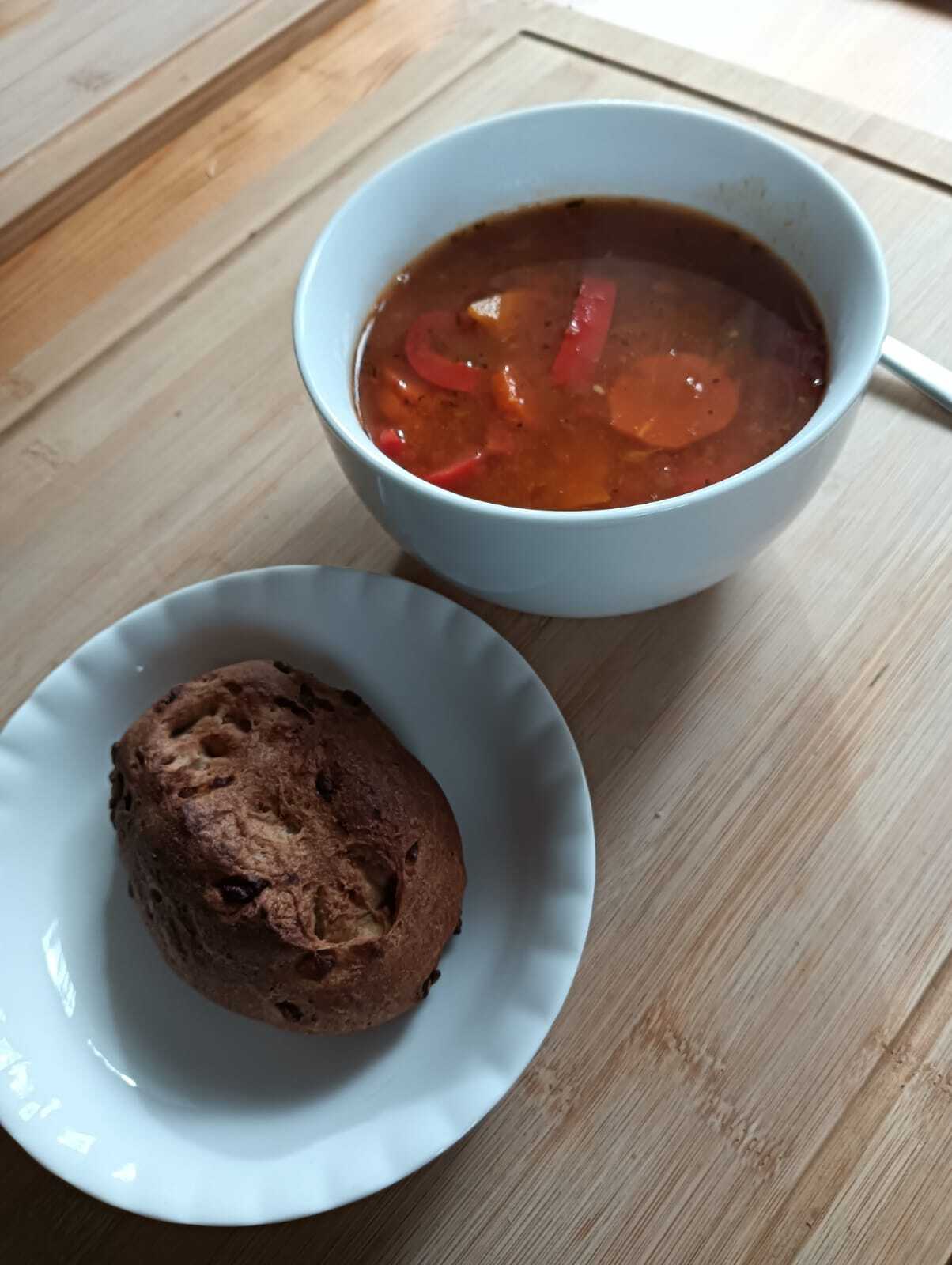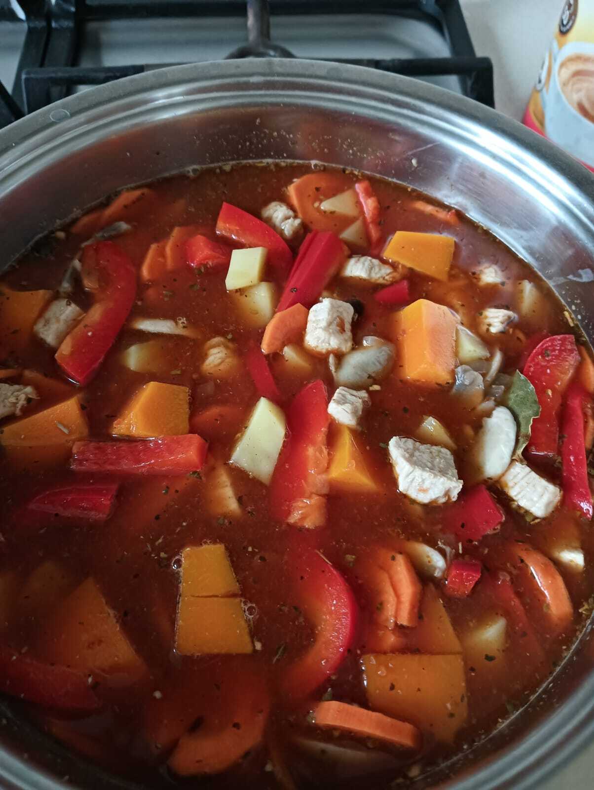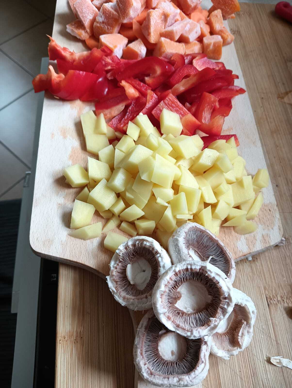 4. warzywa: mała papryka, 1 papryczka chilli, ok. 1/2 szklanki pokrojonej w kostkę dyni, 2 ziemniaki