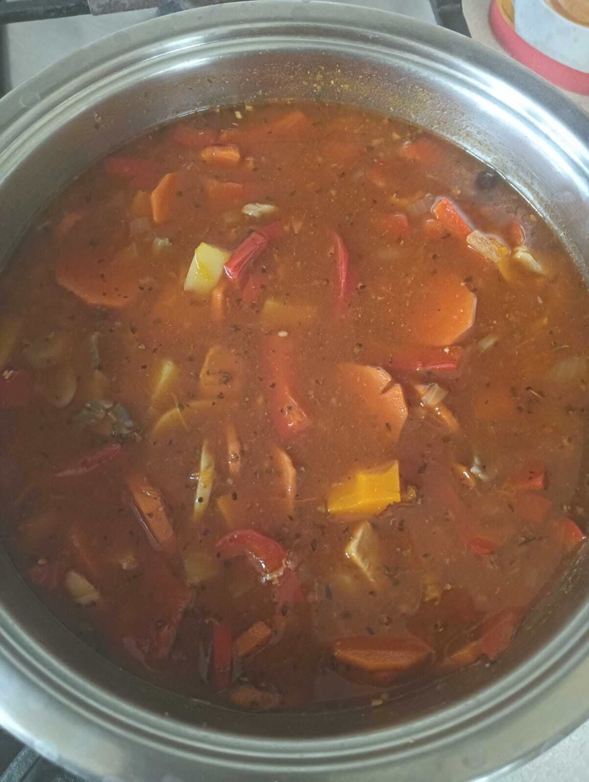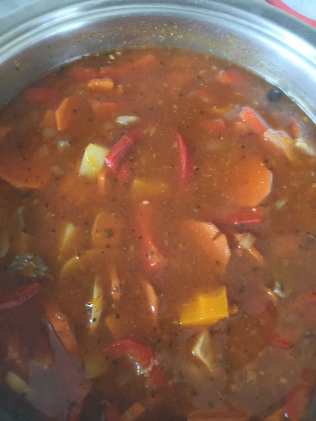 6. 1/4 kostki warzywnej, pieprz, papryka, pieprz cayenne, jarzynka, 2 ziarenka ziela angielskiego, 1 listek laurowy, troszkę suszonych pomidorów