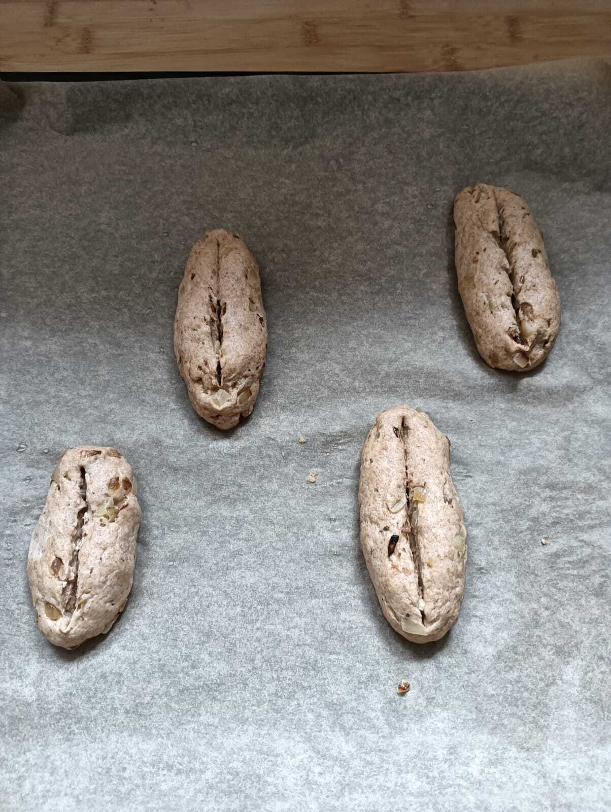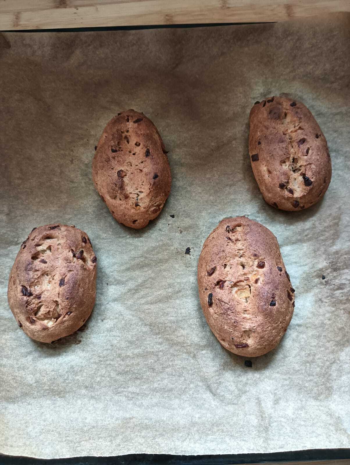 Zrobić zaczyn na bułeczki: drożdże rozpuścić w ciepłej wodzie w towarzystwie cukru i mąki. Kiedy zacznie wytwarzać bąbelki, dodać usmażoną drobno pokrojoną cebulę (na oliwie, która ma później wylądować w cieście). Dodać sól, mąkę i zioła. Rozmieszać. Odstawić na 1h. Uformować podłużne bułeczki, ponacinać nożem, zostawić na papierze do pieczenia ok. 1/2h. Piec ok. 20 minut (monitorować) w temperaturze 200 stopni Celsjusza (również monitorować, być może trzeba będzie dodać nieco temperatury pod koniec pieczenia).
