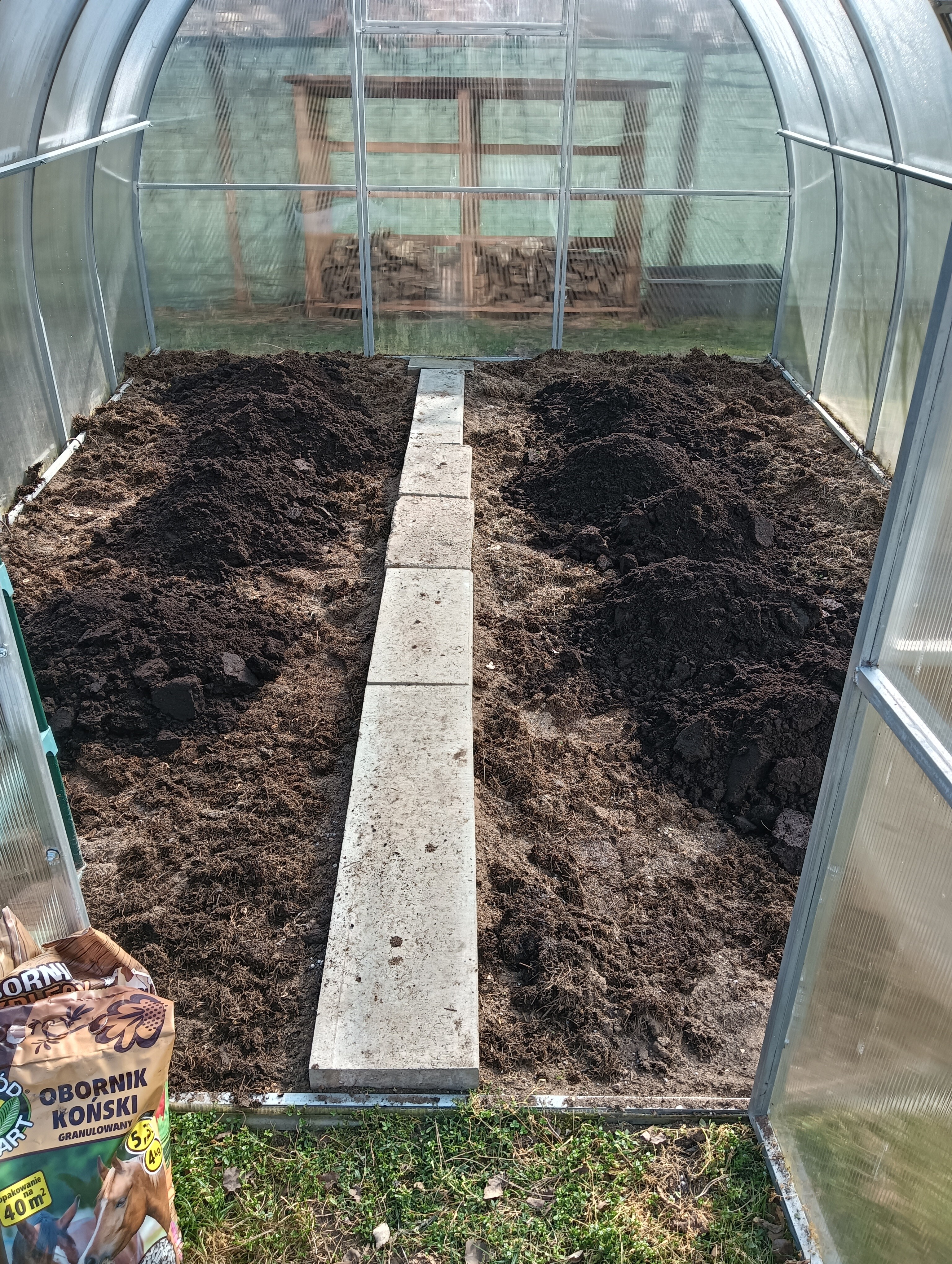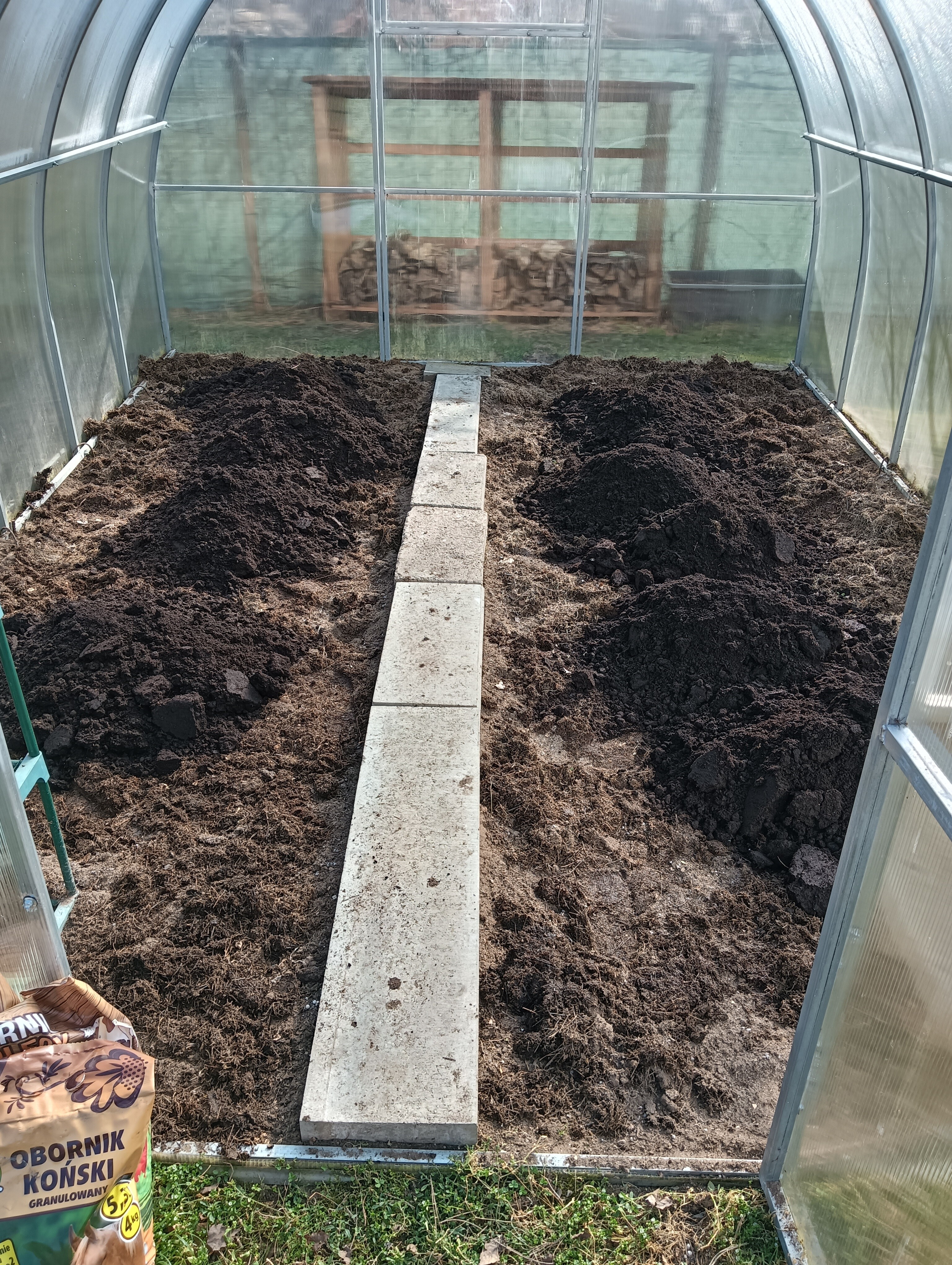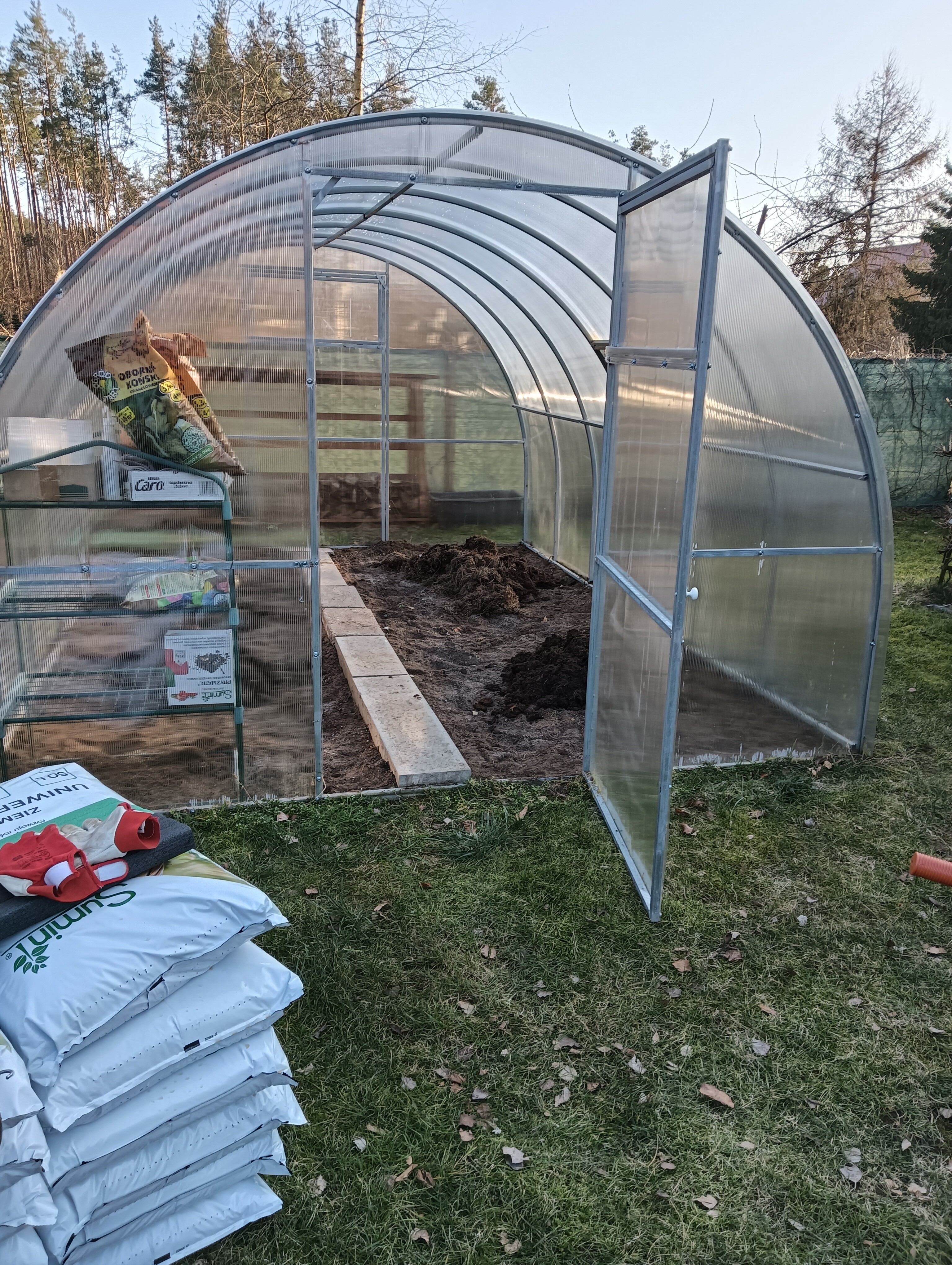 No i wreszcie szklarnia. To już bardziej złożony temat. Na wstępie nadmienię, że nie ma nic lepszego niż własnoręcznie wyhodowane pomidory. Na początku jeszcze w "foliaku" sadziliśmy co się da: rzodkiewkę, pietruszkę marchewkę, ogórki, paprykę i oczywiście pomidory. Okazało się, że nie wszystkie warzywa się lubią. Ponieważ nie jesteśmy wykształconymi ogrodnikami, trochę na zasadzie prób i błędów wypracowaliśmy najlepsze układy towarzyskie dla pomidorów. Tak więc sadzimy same pomidory (kochamy malinówki), do tego koniecznie troszkę truskawkowych koktajlówek, do tego por, seler i wzdłuż ścieżki sałatę. Idealny team. Co roku w tym układzie pomidory rosły i dojrzewały rewelacyjnie.... do czasu, kiedy okazało się, że nasze roślinki też potrafią chorować. Jesienią ubiegłego roku musieliśmy całkowicie odkazić i odgrzybić szklarnię wraz z ziemią. I tak w pierwszej kolejności wywiozłem część ziemi, wychodząc z założeni, że mimo wcześniejszego nawożenia jest już mocno wyjałowiona, następnie szklarnię wraz ziemią dwukrotnie odkaziliśmy parownicą. Na koniec ziemię zasypałem wapnem węglanowym granulowanym w celu regulacji odczynu ziemi oraz poprawienia jakości i wydajności plonów. Obecnie pozostałą ziemię zasypałem fantastyczne przerobionym kompostem z kompostownika, następnie nawiozłem do szklarni brakującą pełnowartościową ziemię, wszystko zasypałem wymieszanym obornikiem końskim, owczym i bydlęcym, a następnie wszystko przekopałem. Porządnie podlałem. Teraz pozostało mi tylko co jakiś czas podlewanie i oczekiwanie na warunki atmosferyczne pozwalające na posadzenie poszczególnych warzy. Mam nadzieję, że wykonane prace przyniosą zamierzony efekt w postaci pięknych i smacznych pomidorów, ale o tym poinformuję we właściwym czasie.