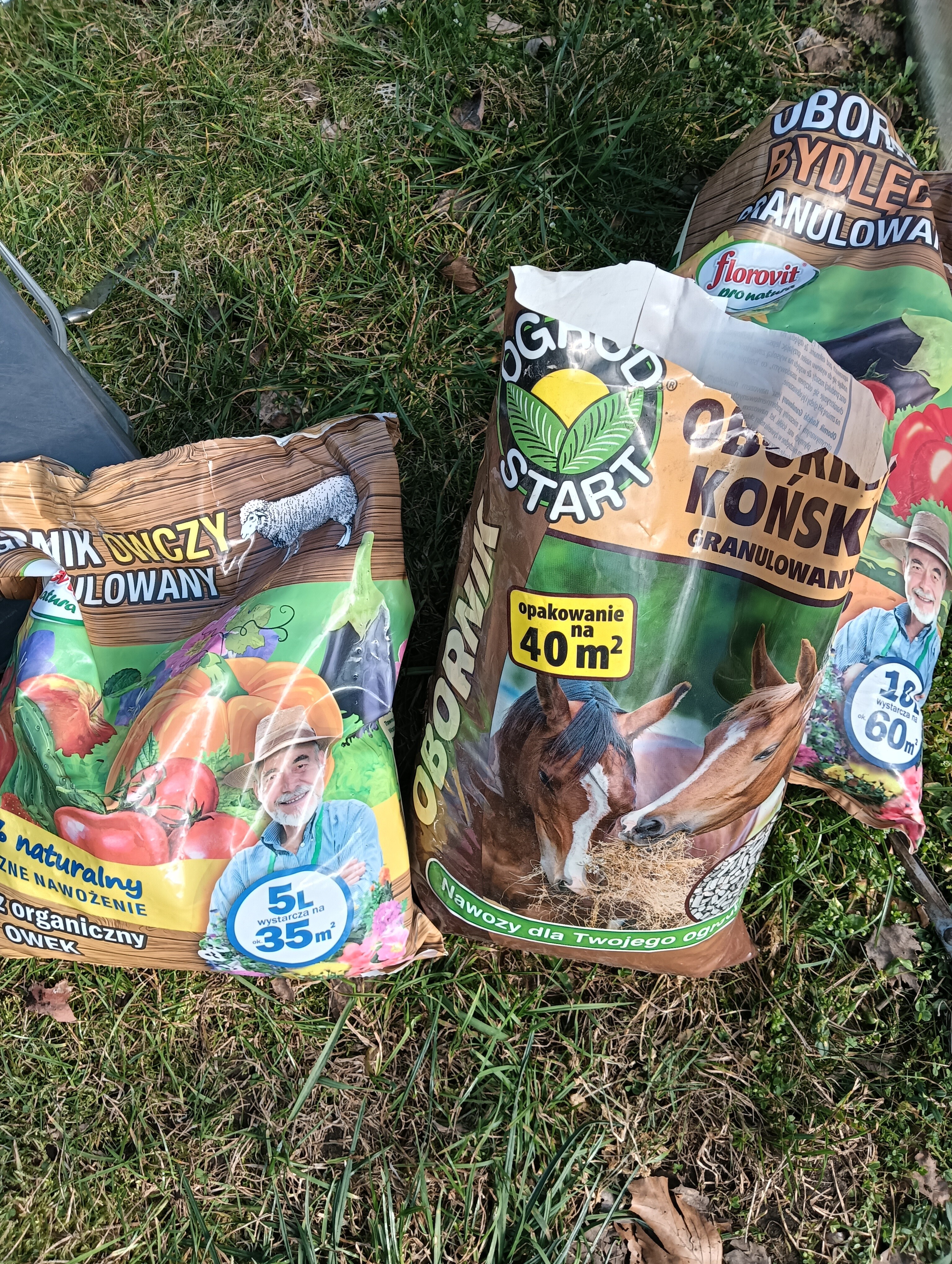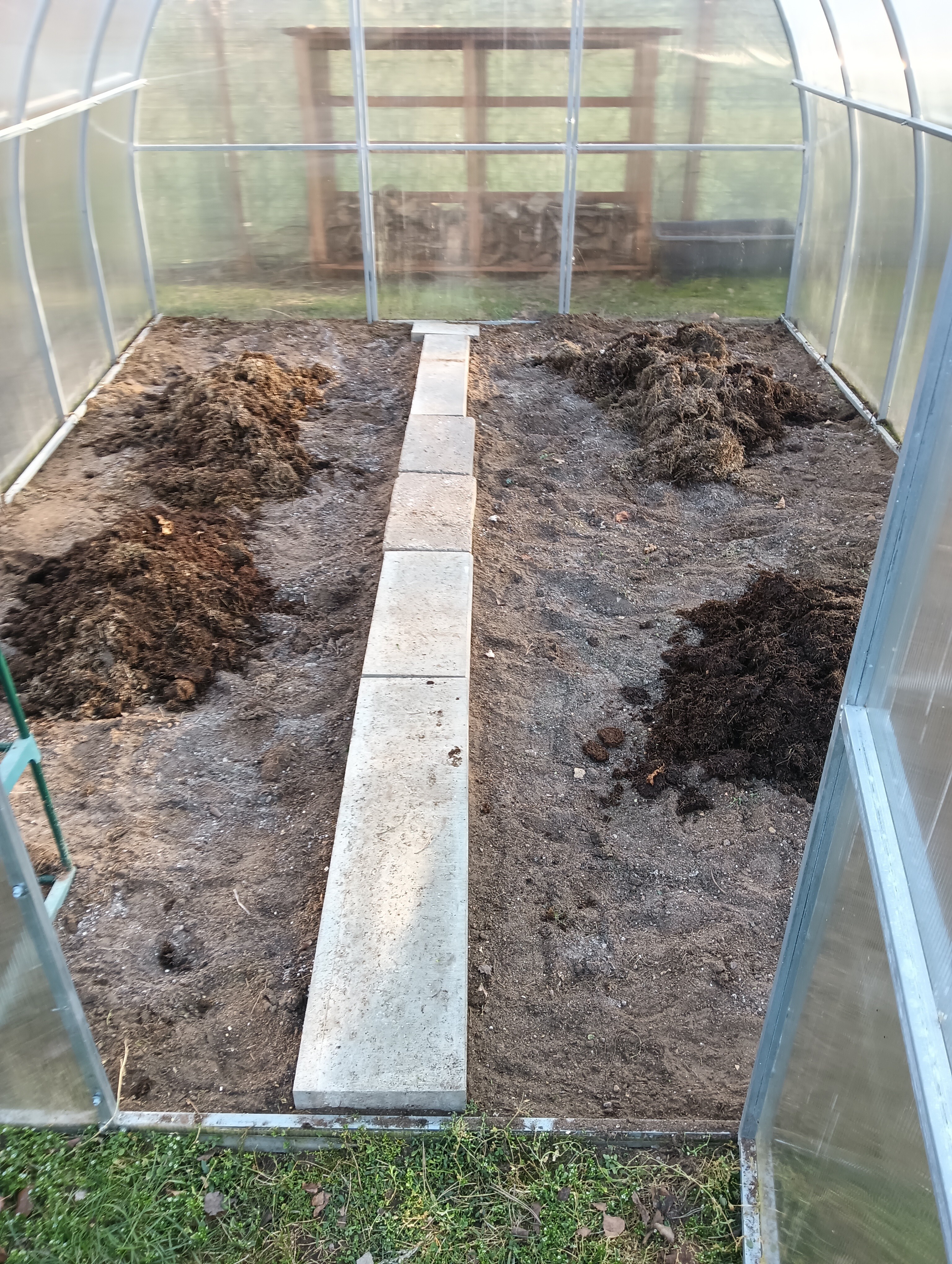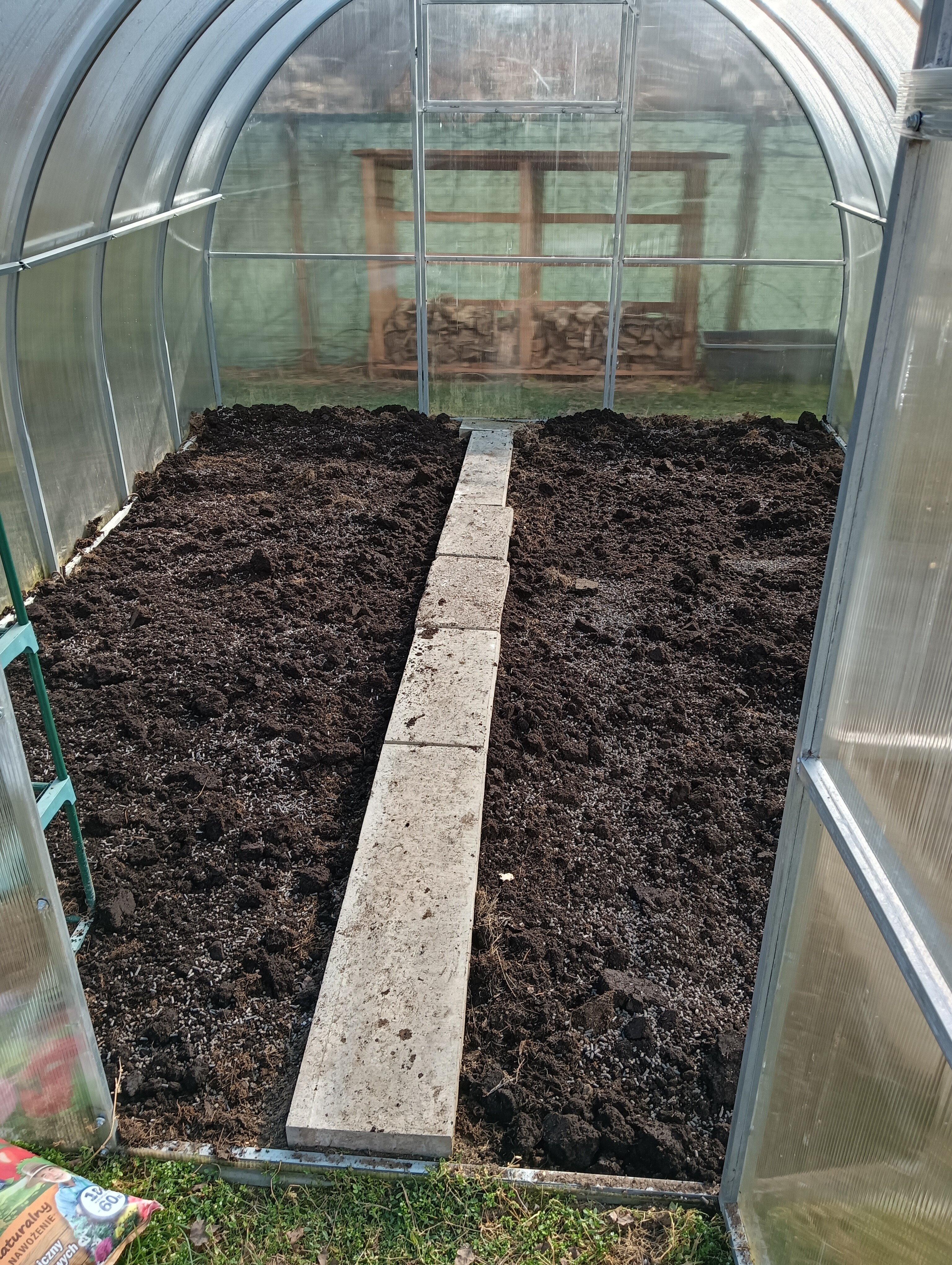No i wreszcie szklarnia. To już bardziej złożony temat. Na wstępie nadmienię, że nie ma nic lepszego niż własnoręcznie wyhodowane pomidory. Na początku jeszcze w "foliaku" sadziliśmy co się da: rzodkiewkę, pietruszkę marchewkę, ogórki, paprykę i oczywiście pomidory. Okazało się, że nie wszystkie warzywa się lubią. Ponieważ nie jesteśmy wykształconymi ogrodnikami, trochę na zasadzie prób i błędów wypracowaliśmy najlepsze układy towarzyskie dla pomidorów. Tak więc sadzimy same pomidory (kochamy malinówki), do tego koniecznie troszkę truskawkowych koktajlówek, do tego por, seler i wzdłuż ścieżki sałatę. Idealny team. Co roku w tym układzie pomidory rosły i dojrzewały rewelacyjnie.... do czasu, kiedy okazało się, że nasze roślinki też potrafią chorować. Jesienią ubiegłego roku musieliśmy całkowicie odkazić i odgrzybić szklarnię wraz z ziemią. I tak w pierwszej kolejności wywiozłem część ziemi, wychodząc z założeni, że mimo wcześniejszego nawożenia jest już mocno wyjałowiona, następnie szklarnię wraz ziemią dwukrotnie odkaziliśmy parownicą. Na koniec ziemię zasypałem wapnem węglanowym granulowanym w celu regulacji odczynu ziemi oraz poprawienia jakości i wydajności plonów. Obecnie pozostałą ziemię zasypałem fantastyczne przerobionym kompostem z kompostownika, następnie nawiozłem do szklarni brakującą pełnowartościową ziemię, wszystko zasypałem wymieszanym obornikiem końskim, owczym i bydlęcym, a następnie wszystko przekopałem. Porządnie podlałem. Teraz pozostało mi tylko co jakiś czas podlewanie i oczekiwanie na warunki atmosferyczne pozwalające na posadzenie poszczególnych warzy. Mam nadzieję, że wykonane prace przyniosą zamierzony efekt w postaci pięknych i smacznych pomidorów, ale o tym poinformuję we właściwym czasie.